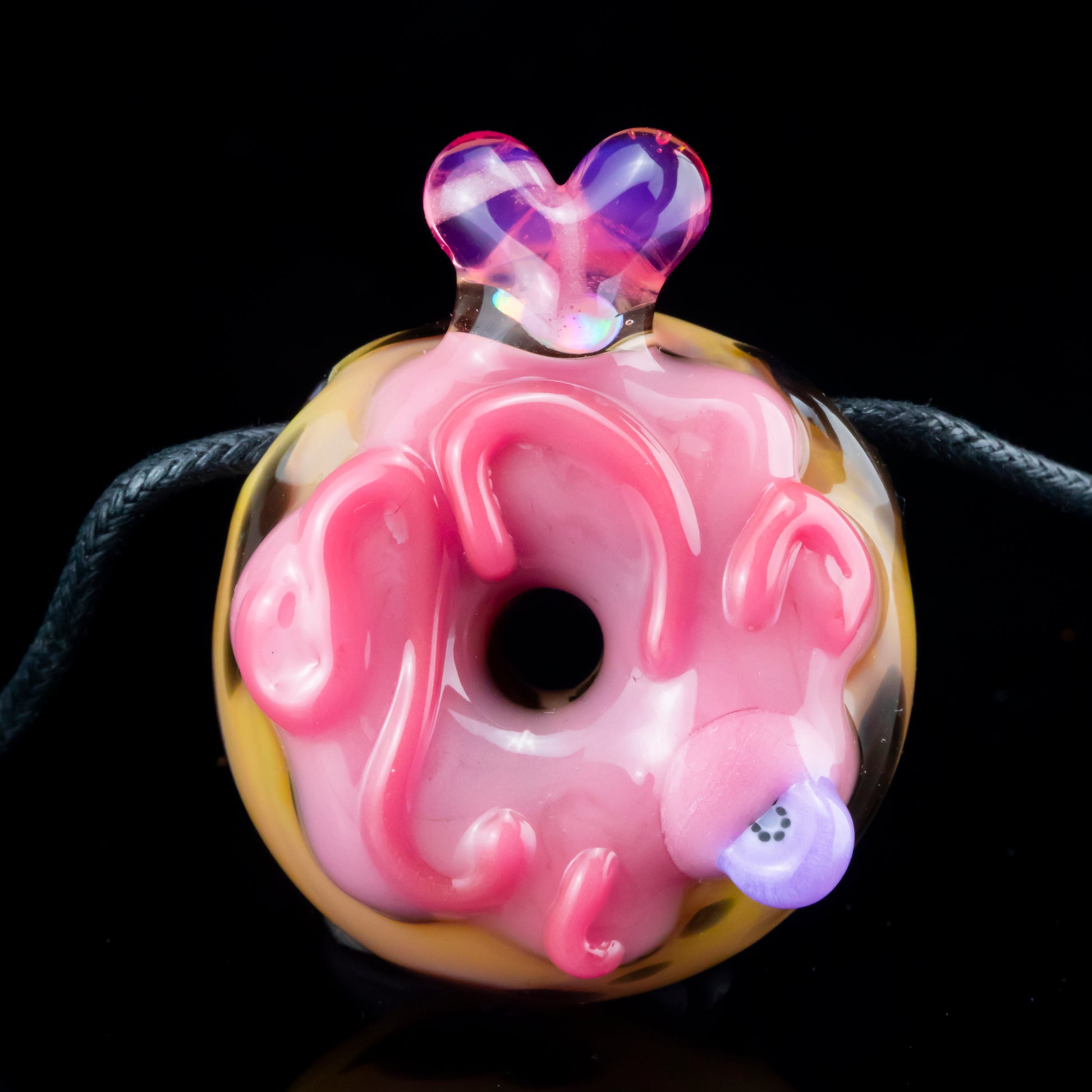 Leopard print base donut - strawberry frosted w/ light strawberry drizzle - topped with pink heart, opal, and dipped kiwi